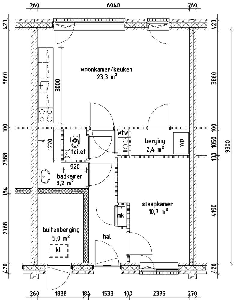 De woningen bestaan uit een woonkamer met keukenblok, een slaapkamer, badkamer, toilet , inpandige berging en een buitenberging.